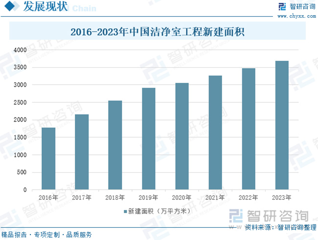 目前,全球半導(dǎo)體、光電等電子信息產(chǎn)業(yè)在世界范圍內(nèi)轉(zhuǎn)移,東亞、東南亞等地區(qū)已成為世界電子信息行業(yè)的主要市場和發(fā)展重心;同時由于我國醫(yī)藥衛(wèi)生、半導(dǎo)體、航空航天等事業(yè)的不斷發(fā)展,加速推動了潔凈室的市場化需求,從而帶動我國潔凈室工程產(chǎn)業(yè)的快速發(fā)展。2023年,中國潔凈室工程新建面積達(dá)3689萬平方米,同比增長6.04%。